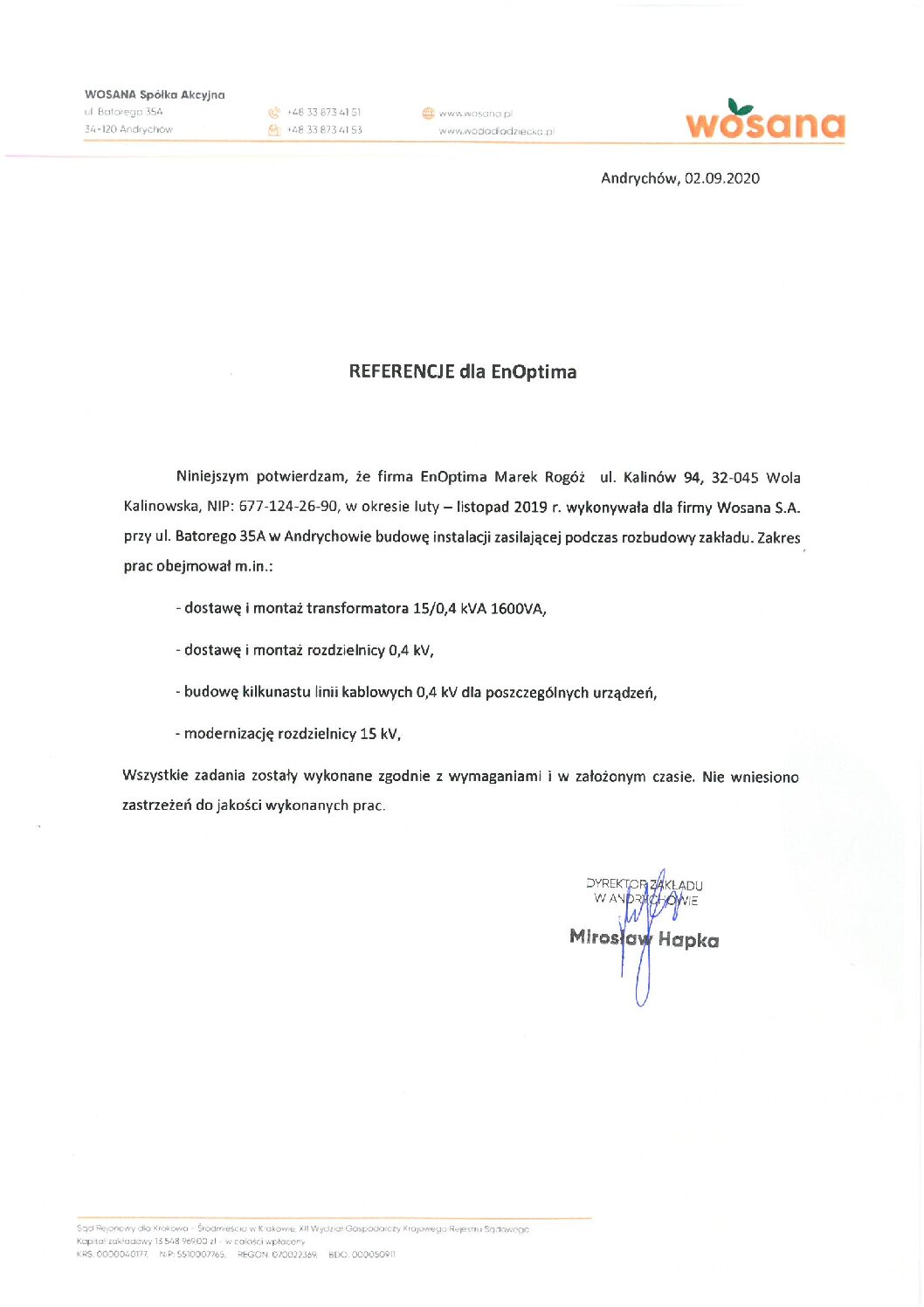 Funkcja: Projektant” - „Projekt wykonawczy przebudowy zasilania zakładu WOSANA S.A. w Andrychowie w związku z budową linii rozlewniczej KRONES. Całkowita wartość inwestycji 52 mln PLN,