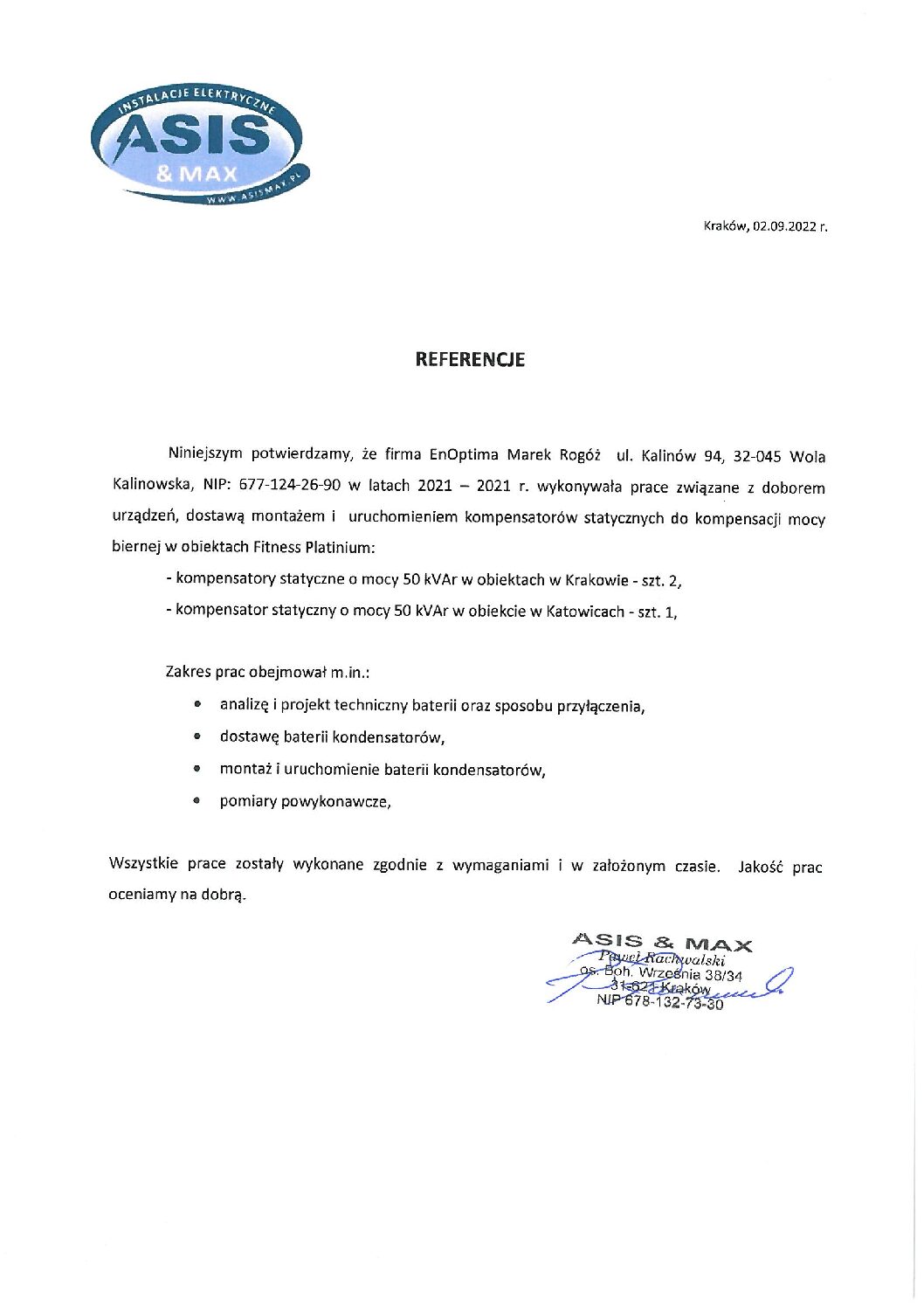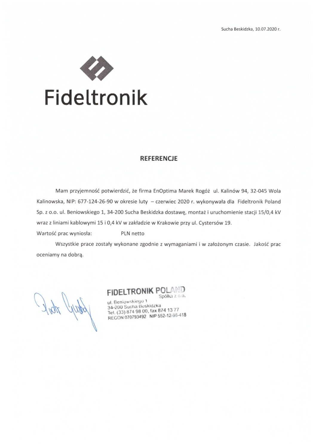 - Budowa stacji 15/0,4 kV wraz z liniami kablowymi 15 i 0,4 kV, Kraków dla firmy Fideltronik Poland S.A.