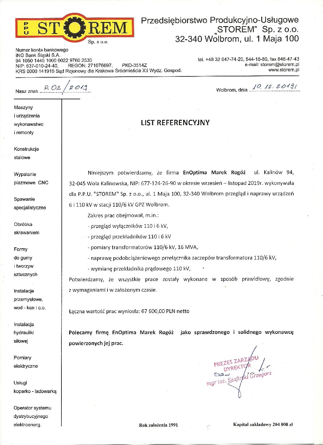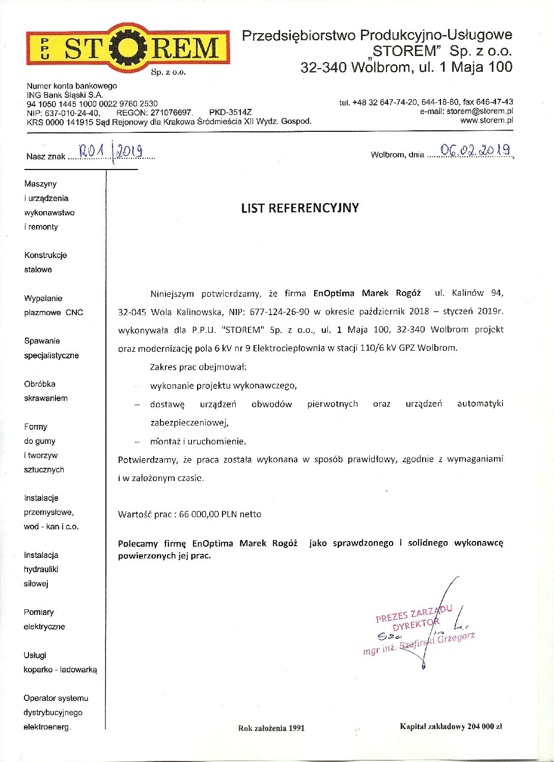 - Modernizacja pola 6 kV Elektrociepłownia w stacji 110/6 kV Wolbrom dla PHU STOREM Wolbrom Sp. z o.o.